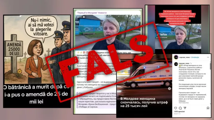 Pe 11 aprilie, canalul de Telegram „Первый в Молдове” a publicat un mesaj potrivit căruia o femeie de 82 de ani, din satul Cremenciug, raionul Soroca, a decedat după ce polițiștii i-au aplicat o amendă de 25.000 de lei. Informația a fost însoțită de o secvență video în care Irina Bezbașennaia, reprezentantă a blocului politic Victorie, susținea că femeia nu a rezistat și a murit a doua zi după primirea procesului-verbal. Informația a fost răspândită rapid pe rețelele sociale, inclusiv unele cunoscute pentru promovarea dezinformării. Poliția spune că informația este falsă, iar femeia care a lansat acuzația s-a ales cu proces-verbal, scrie stopfals.md.