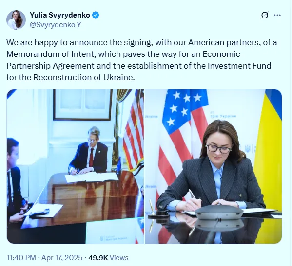 „Suntem încântați să anunțăm semnarea, cu partenerii noștri americani, a unui protocol de intenție care deschide calea către un acord de parteneriat economic și crearea Fondului de investiții pentru reconstrucția Ucrainei”, a scris pe X oficiala.