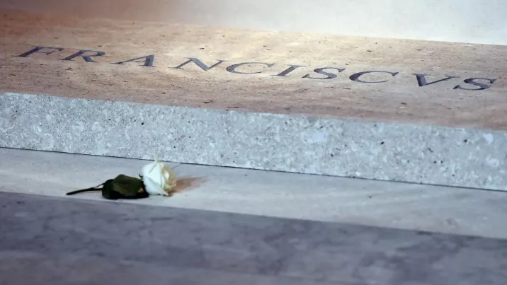 Piatra de mormânt poartă o singură inscripție, „Franciscus”, numele în latină al lui Francisc, în conformitate cu testamentul defunctului Papă.