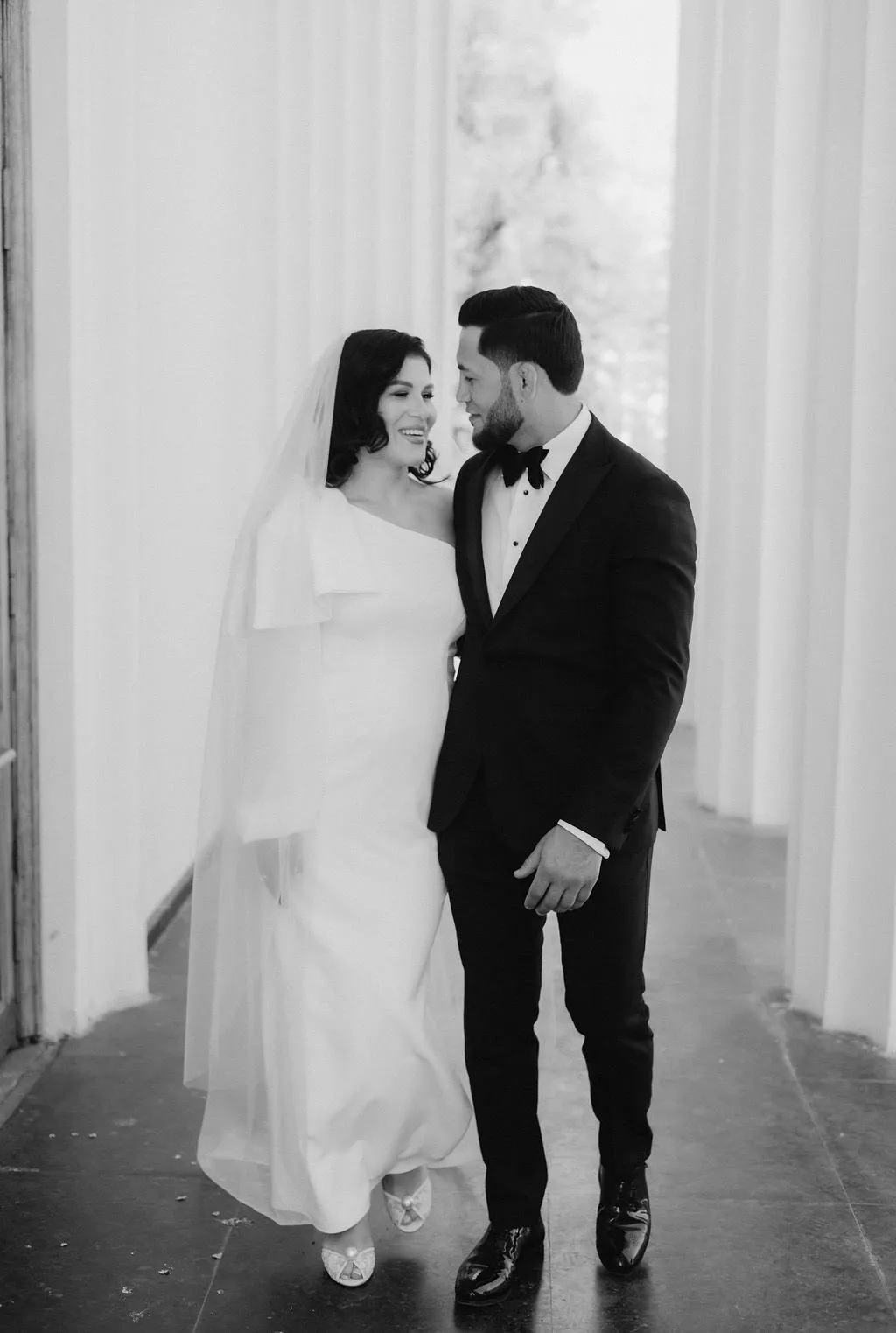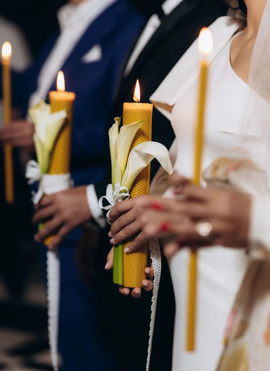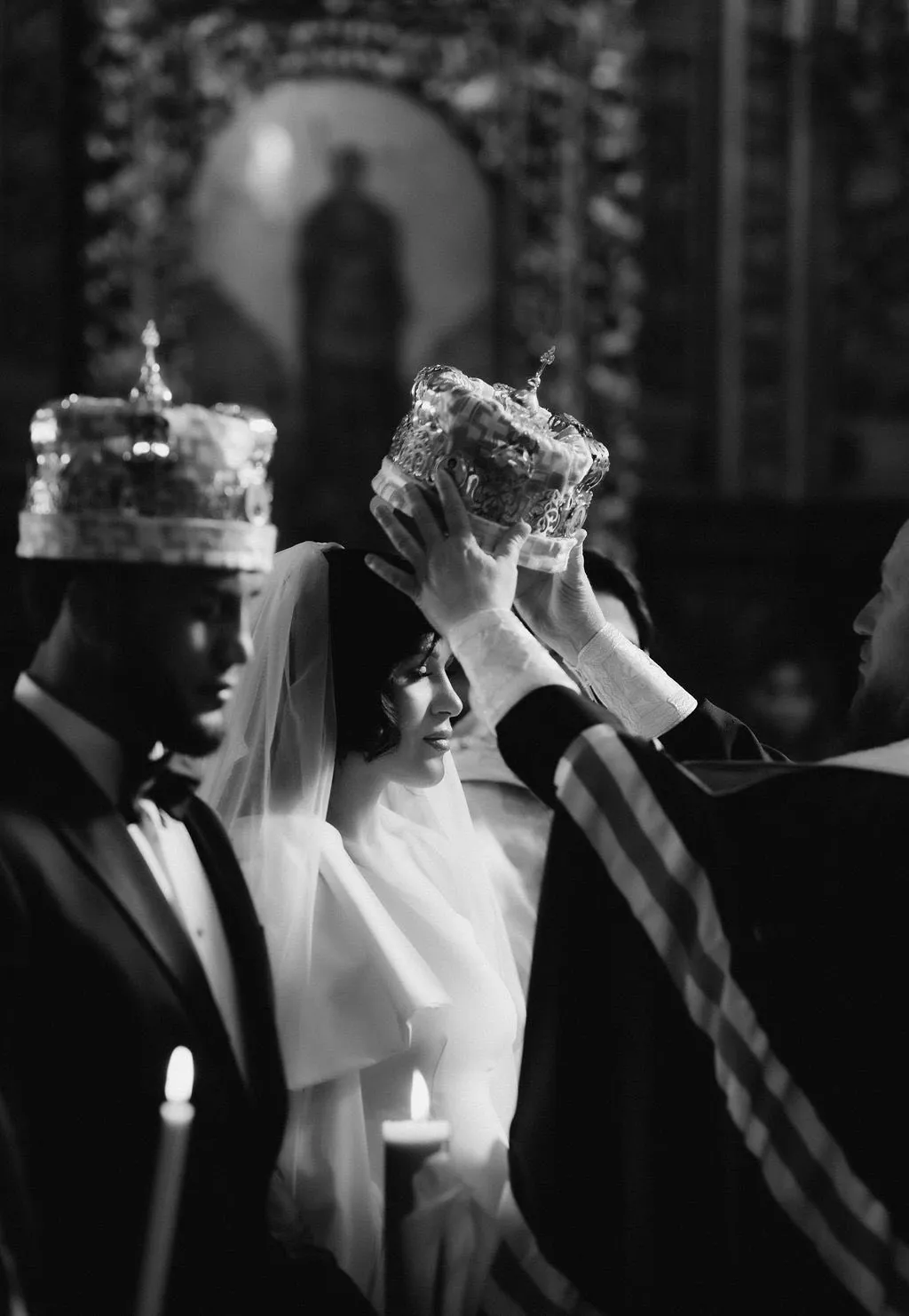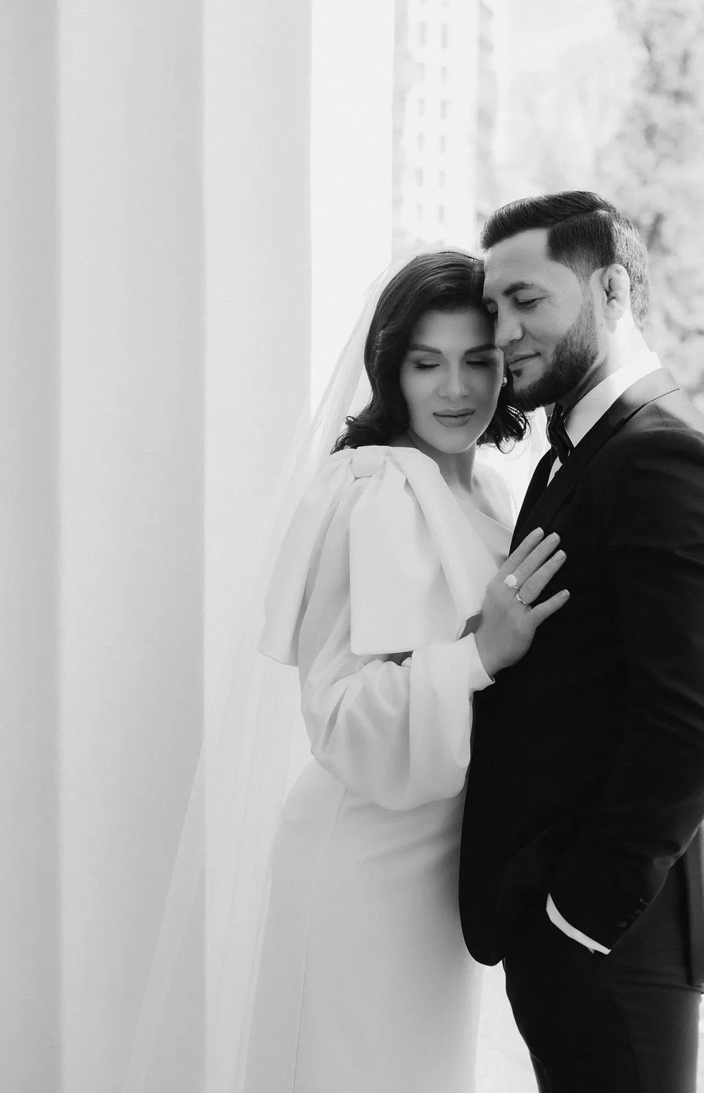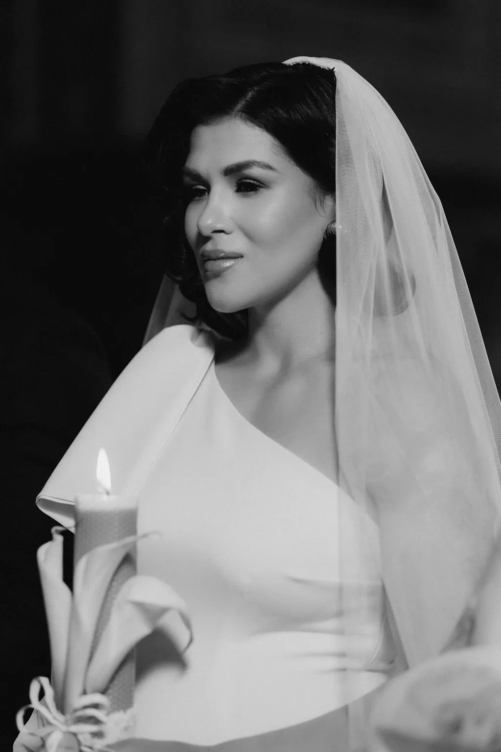 Mireasa a purtat un voal lung, clasic, iar mirele Valeriu Mircea, un costum negru clasic, asortat cu o cămașă albă și un papion negru.