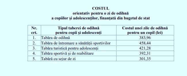 - la o tabără de odihnă, pentru un copil, va ajunge la 383,96 de lei, în comparație cu 357,84 de lei anul trecut;