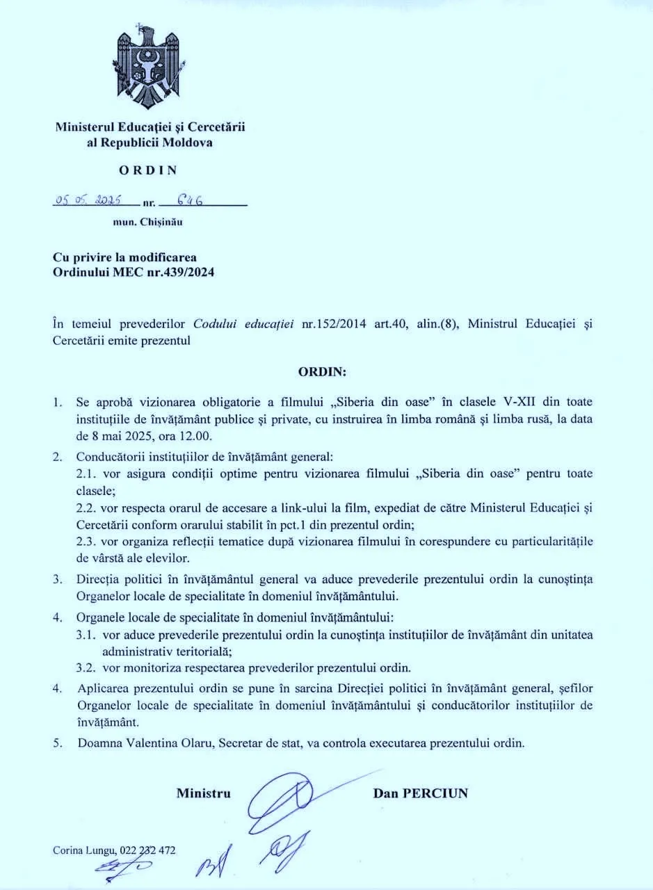 Filmul „Siberia din oase” va fi vizionat obligatoriu de către elevii claselor V-XII, din toate instituțiile de învățământ publice și private din țară, cu instruirea în limba română și limba rusă, vineri, 8 mai, de la ora 12. Ordinul a fost semnat de ministrul Educației, Dan Perciun.