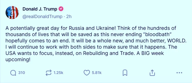 „O zi cu potențial mare pentru Rusia și Ucraina! Gândiți-vă la sutele de mii de vieți care vor fi salvate atunci când această „baie de sânge” fără sfârșit va ajunge, sperăm, la un final. Va fi o lume cu totul nouă și mult mai bună. Voi continua să lucrez cu ambele părți pentru a mă asigura că acest lucru se va întâmpla. SUA vrea, în schimb, să se concentreze pe Reconstrucție și Comerț. O săptămână mare urmează!”, a scris Donald Trump.