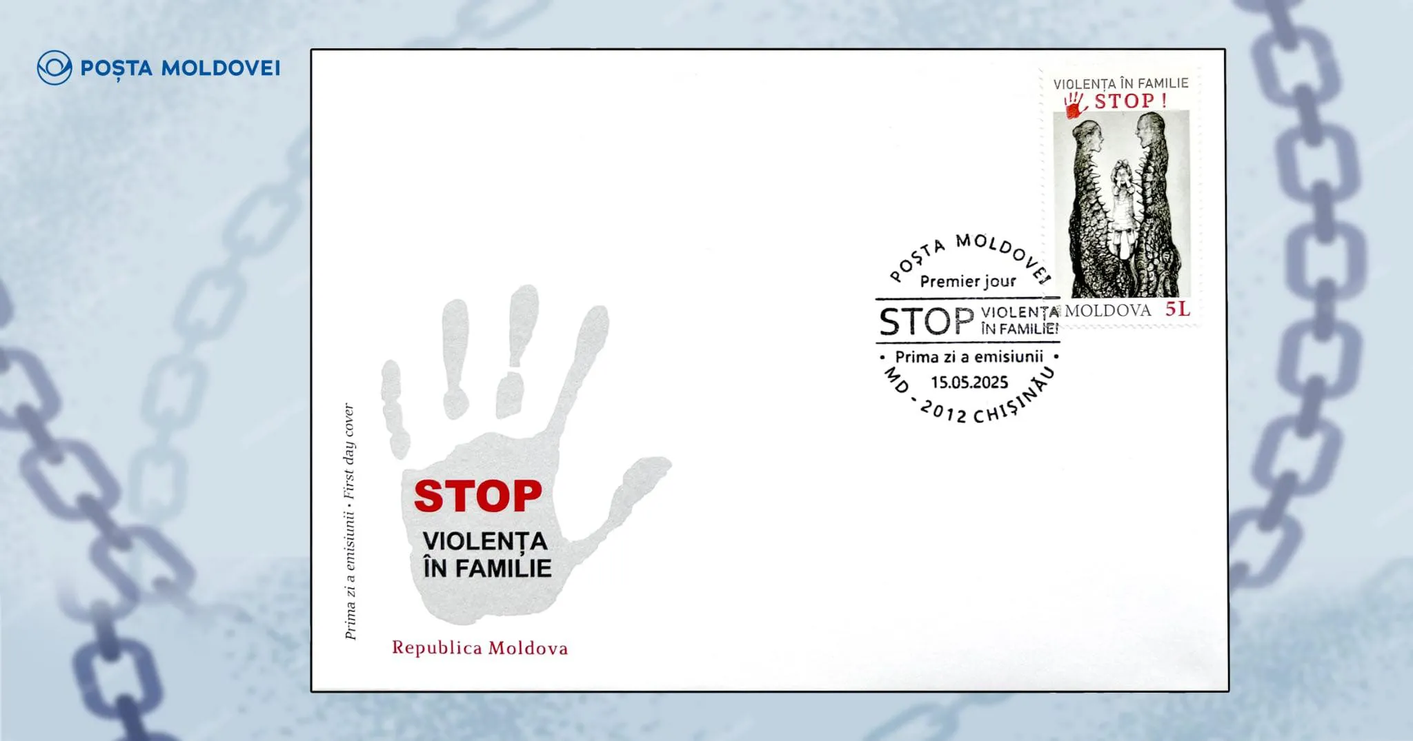 Poșta Moldovei a pus în circulație o serie de mărci poștale speciale, precum și un plic, cu genericul „Stop Violența în familie” și „Prima zi”. Produsele sunt comercializate de ieri, 15 mai 2025.