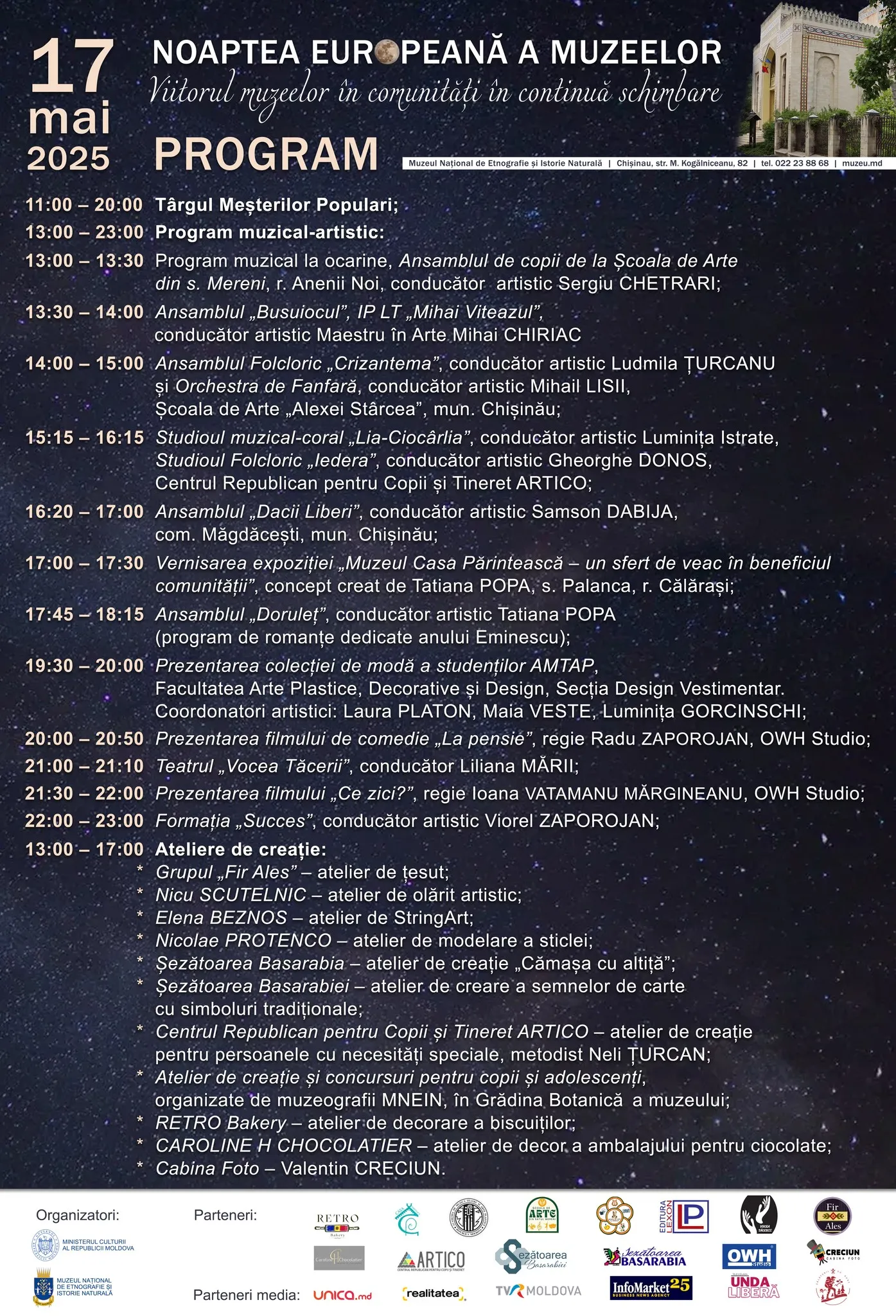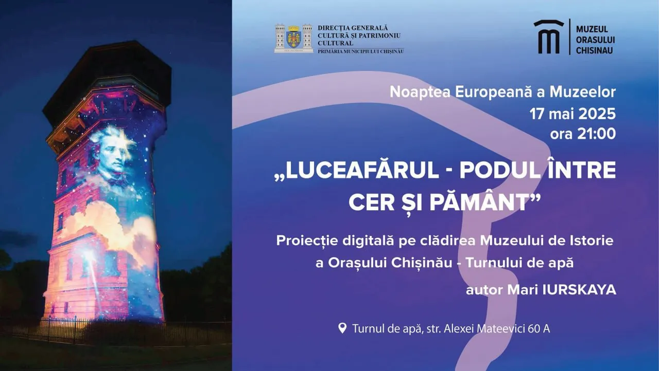 Și la Muzeul de Istorie a Orașului Chișinău – Turnul de Apă pe17 mai 2025, până la ora 21:00 vă veți putea delecta cu un program artistic desăvârșit, proiecție digitală spectaculoasă pe Turnul de Apă, semnată de Mari Iurskaya: Luceafărul – podul între cer și pământ.