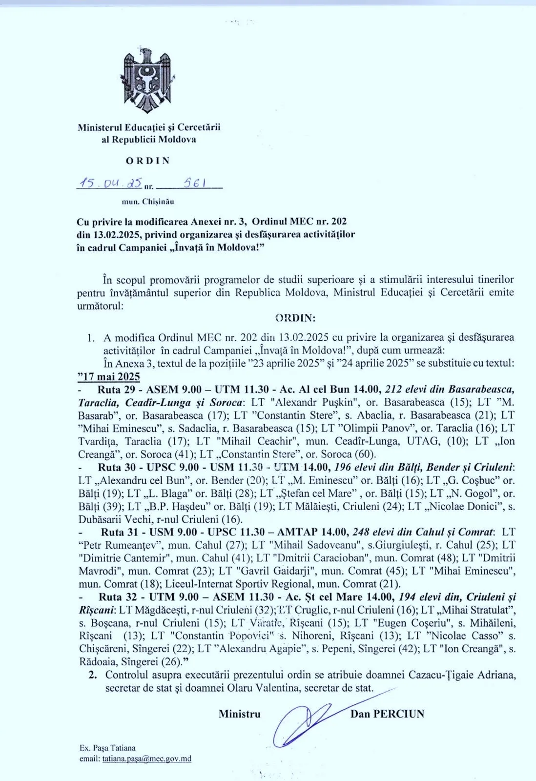„Anumiți politicieni și pagini afiliate lor, fără niciun fel de jenă, au început să distribuie poze cu autobuzele școlare folosite în cadrul campaniei naționale «Învață în Moldova», insinuând că ar fi fost utilizate pentru transport electoral.Realitatea este alta. Ieri, câteva sute de elevi din întreaga țară au venit la Chișinău pentru a vizita universitățile, inclusiv Universitatea Tehnică a Moldovei, în cadrul unei activități organizate de Ministerul Educației și Cercetării pentru a promova studiile universitare în Republica Moldova. Această manipulare nu doar că e lipsită de scrupule, dar jignește efortul sincer al celor care vor să le ofere tinerilor oportunități reale de a învăța și de a-și construi un viitor acasă”, a scris ministrul pe pagina sa de Facebook, atașând și ordinul privind organizarea și desfășurarea activităților din cadrul campaniei.