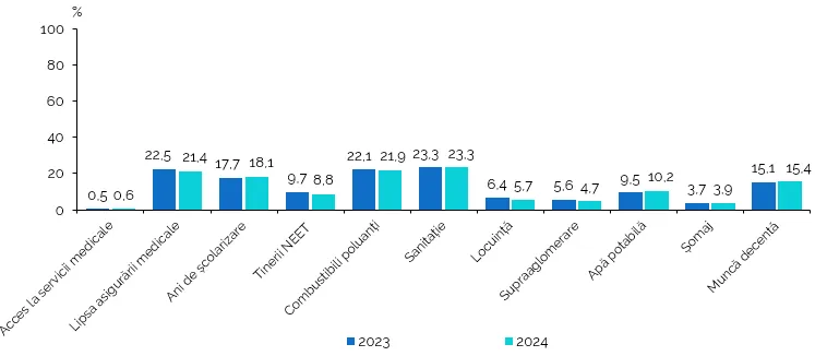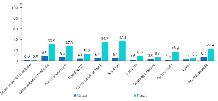 În sate, peste o treime din populație (37,6%) se confruntă cu lipsuri semnificative, față de doar 10% în orașe, iar intensitatea acestor neajunsuri este mai pronunțată la sat — persoanele afectate suferă, în medie, în 46,6% dintre indicatorii analizați, comparativ cu 43,2% în mediul urban. Cele mai mari decalaje apar la accesul la sanitație (37,3% în rural față de 5,1% în urban), folosirea combustibililor poluanți (34,7% vs. 5,2%) și lipsa asigurării medicale (30,9% vs. 9%).