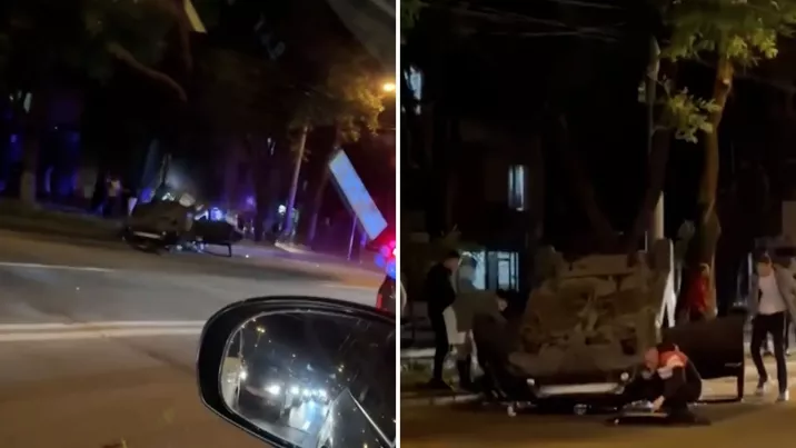/VIDEO/ Impact violent pe un bulevard din Chișinău: O mașină s-a răsturnat, iar martorii au salvat șoferul