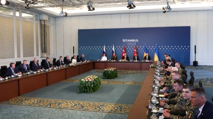 Delegațiile Rusiei și Ucrainei sunt așezate în timpul negocierilor la Istanbul de o parte și de alta a unei mese în formă de U, iar între ele se află reprezentanții Turciei, potrivit imaginilor transmise în direct. La fel ca în prima rundă de negocieri, în spatele mesei sunt plasate câte două steaguri ale Rusiei, Turciei și Ucrainei.