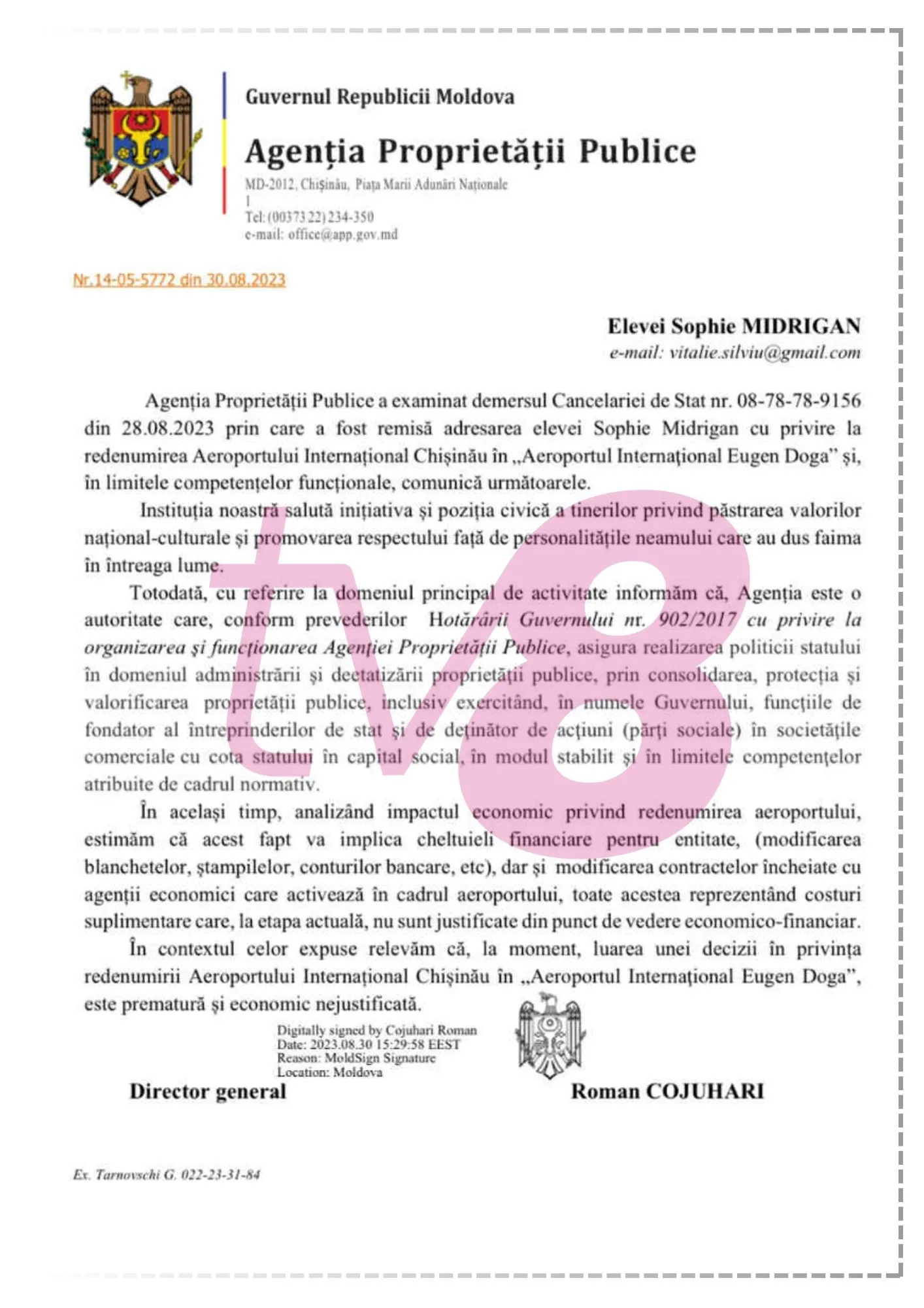 „Redenumirea aeroportului va implica cheltuieli financiare pentru entitate (modificarea blanchetelor, ștampilelor, conturilor bancare etc.), dar și modificarea contractelor încheiate cu agenții economici care activează în cadrul aeroportului. Acestea reprezintă costuri suplimentare care, la etapa actuală, nu sunt justificate din punct de vedere economico-financiar (...) Luarea unei decizii în privința redenumirii Aeroportului Internațional Chișinău în ‘Eugen Doga’ este, la moment, prematură și economic nejustificată”.