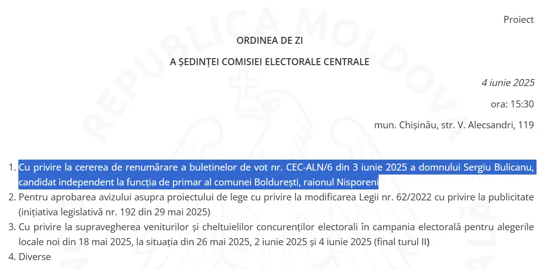 Sergiu Bulicanu, contracandidatul lui Nicanor Ciochină la alegerile pentru Primăria Boldurești, a cerut renumărarea voturilor exprimate pe 1 iunie. Cererea sa va fi examinată pe 4 iunie, în cadrul ședinței Comisiei Electorale Centrale (CEC).