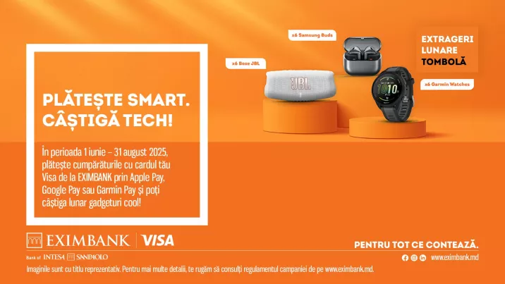 Începând cu 1 iunie și până pe 31 august 2025, EXIMBANK te invită să intri în tombola pentru premii de ultimă generație! Tot ce trebuie să faci este să folosești cardul tău Visa de la EXIMBANK prin Apple Pay, Google Pay sau Garmin Pay în perioada campaniei, iar fiecare plată îți crește șansa de câștig!