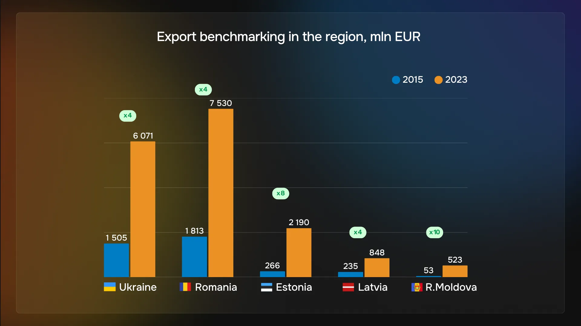Exporturile de servicii IT au crescut spectaculos, ajungând în 2023 la 523 milioane de euro, de 10 ori mai mult decât în 2015 (53 milioane euro). Deși volumul absolut este inferior celui raportat de țări precum România (7,5 miliarde euro) sau Ucraina (6 miliarde euro), ritmul de creștere al Moldovei este cel mai rapid din regiune.