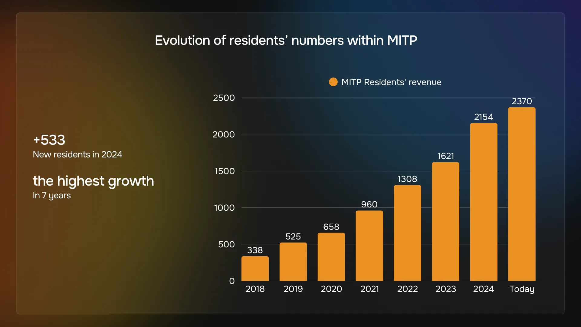 În prezent, MITP numără peste 2.370 de companii rezidente, dintre care 533 s-au alăturat doar în 2024 – cea mai mare creștere anuală de la înființarea Parcului. Este un semnal clar al atractivității tot mai mari pe care o are Moldova în ochii investitorilor internaționali, datorită unui regim fiscal competitiv, unui mediu de afaceri stabil și recunoașterii în creștere a Moldovei ca destinație tech emergentă în Europa de Est.