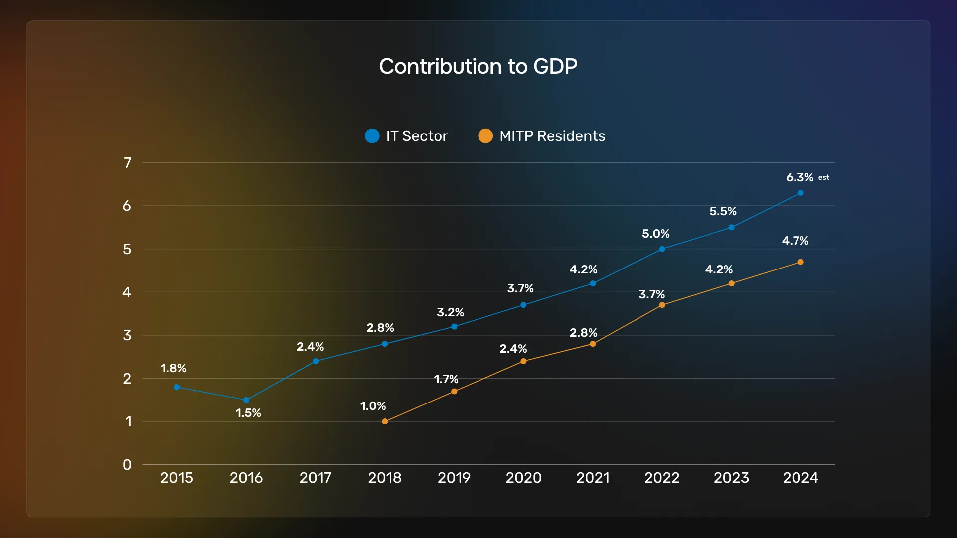 Contribuția sectorului IT la economia națională a crescut semnificativ, ajungând la 6,3% din PIB în 2024, potrivit estimărilor preliminare, față de 1,8% în 2015. Această evoluție remarcabilă este rezultatul direct al expansiunii companiilor tech, al politicilor fiscale favorabile și al atragerii susținute de investiții externe.