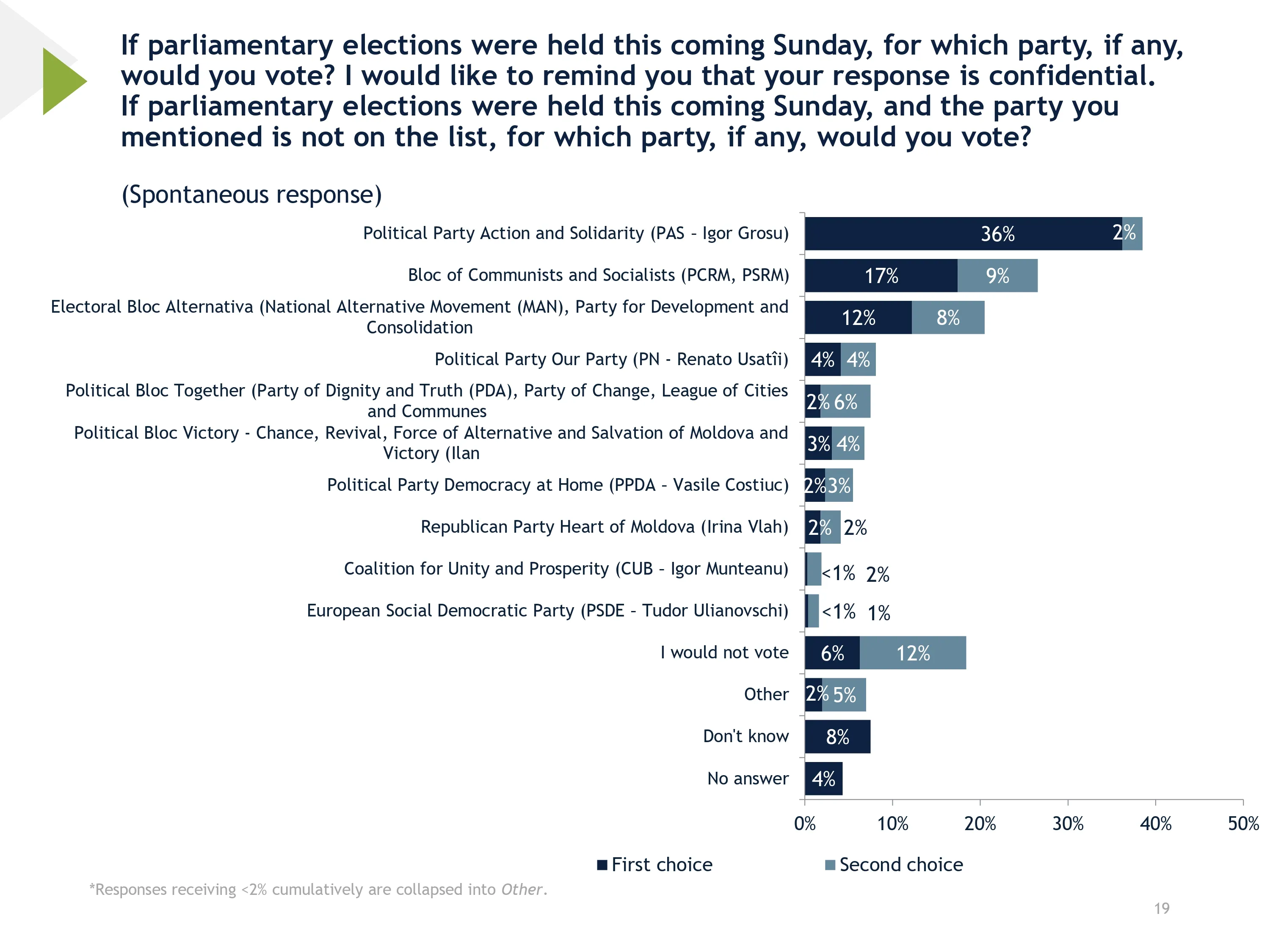Potrivit răspunsurilor spontane ale participanților, PAS, condus de Igor Grosu, ar obține 36% din voturi. BCS ar acumula 17%, iar Blocul Alternativa, al cărui lider este Ion Ceban, ar fi votat de 12% dintre respondenți.