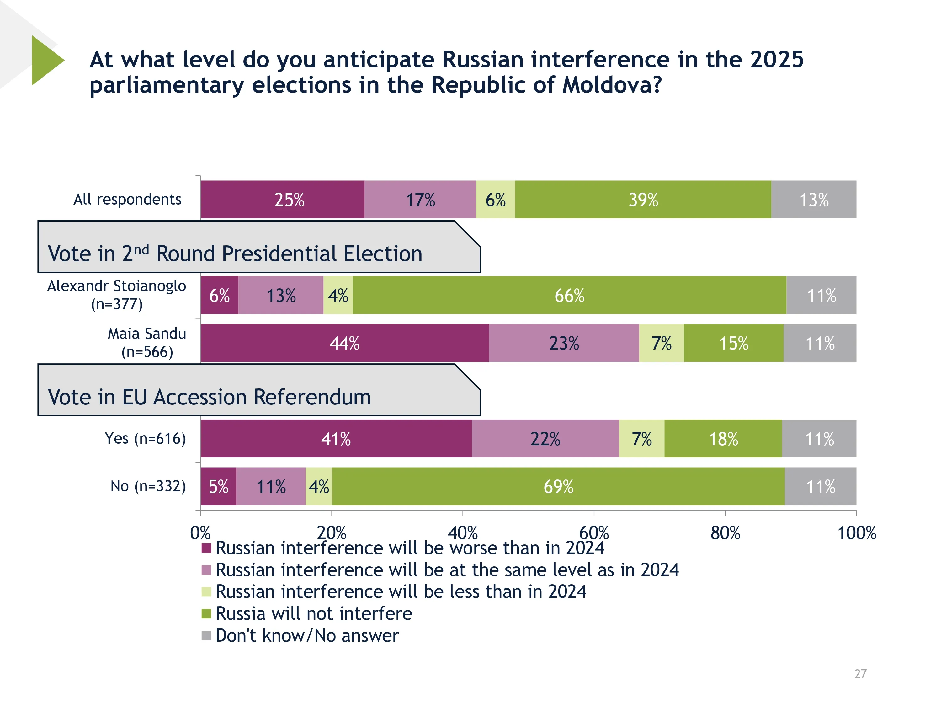 Întrebați ce nivel de interferență rusească anticipează în alegerile parlamentare din 2025, 25% dintre respondenți au spus că va fi mai gravă decât în 2024, iar 17% cred că se va menține la același nivel.