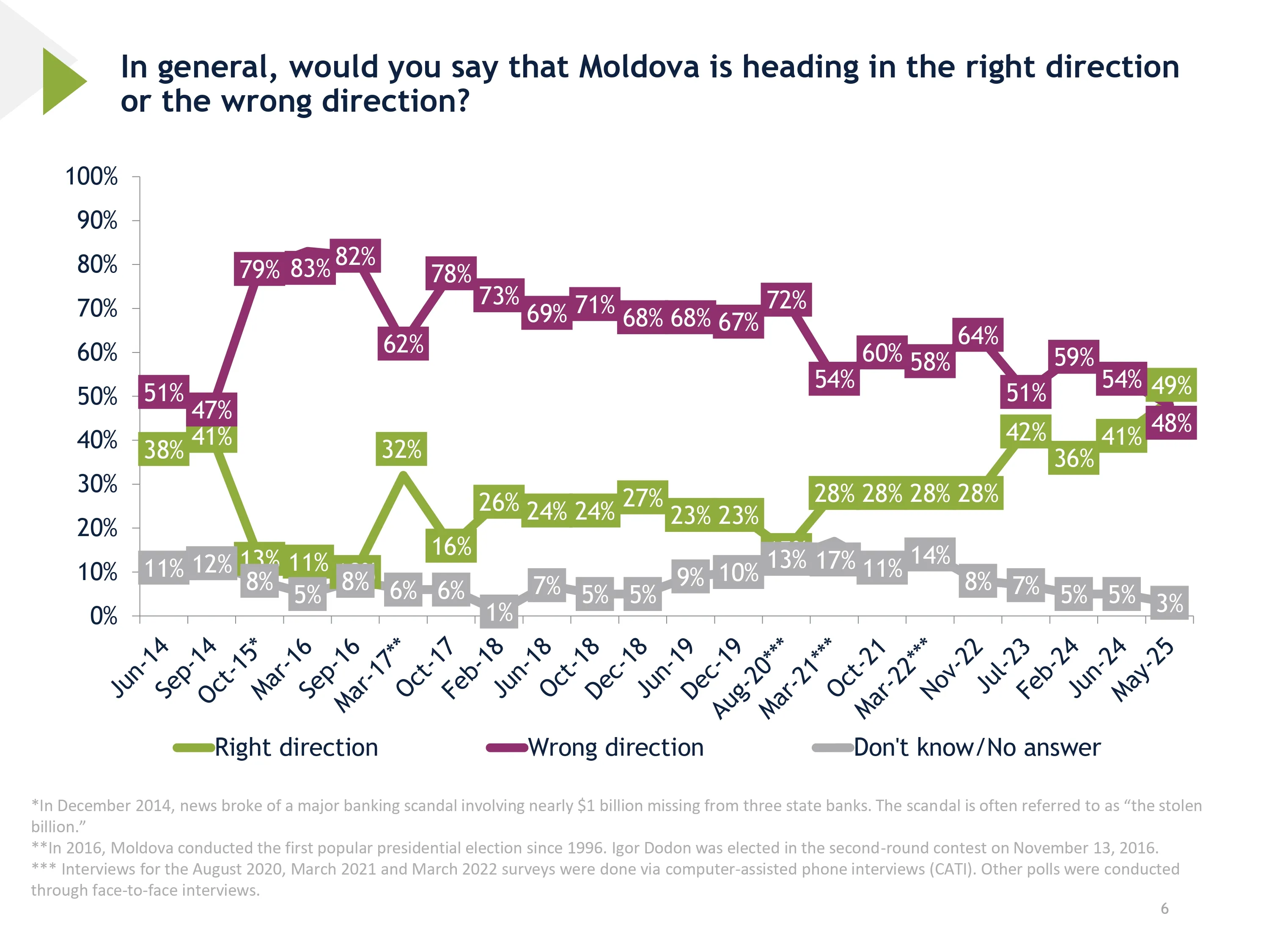 Aproape jumătate dintre moldoveni cred că țara merge într-o direcție bună. Cel puțin asta arată datele unui sondaj realizat de Magenta Consulting pentru Institutul Republican Internațional (IRI). Este cel mai ridicat nivel de optimism înregistrat din 2014 până în prezent. În același timp, 48% dintre respondenți sunt de părere că lucrurile merg pe calea greșită. Doar 3% dintre respondenți au spus că nu știu sau nu au răspuns la întrebare.