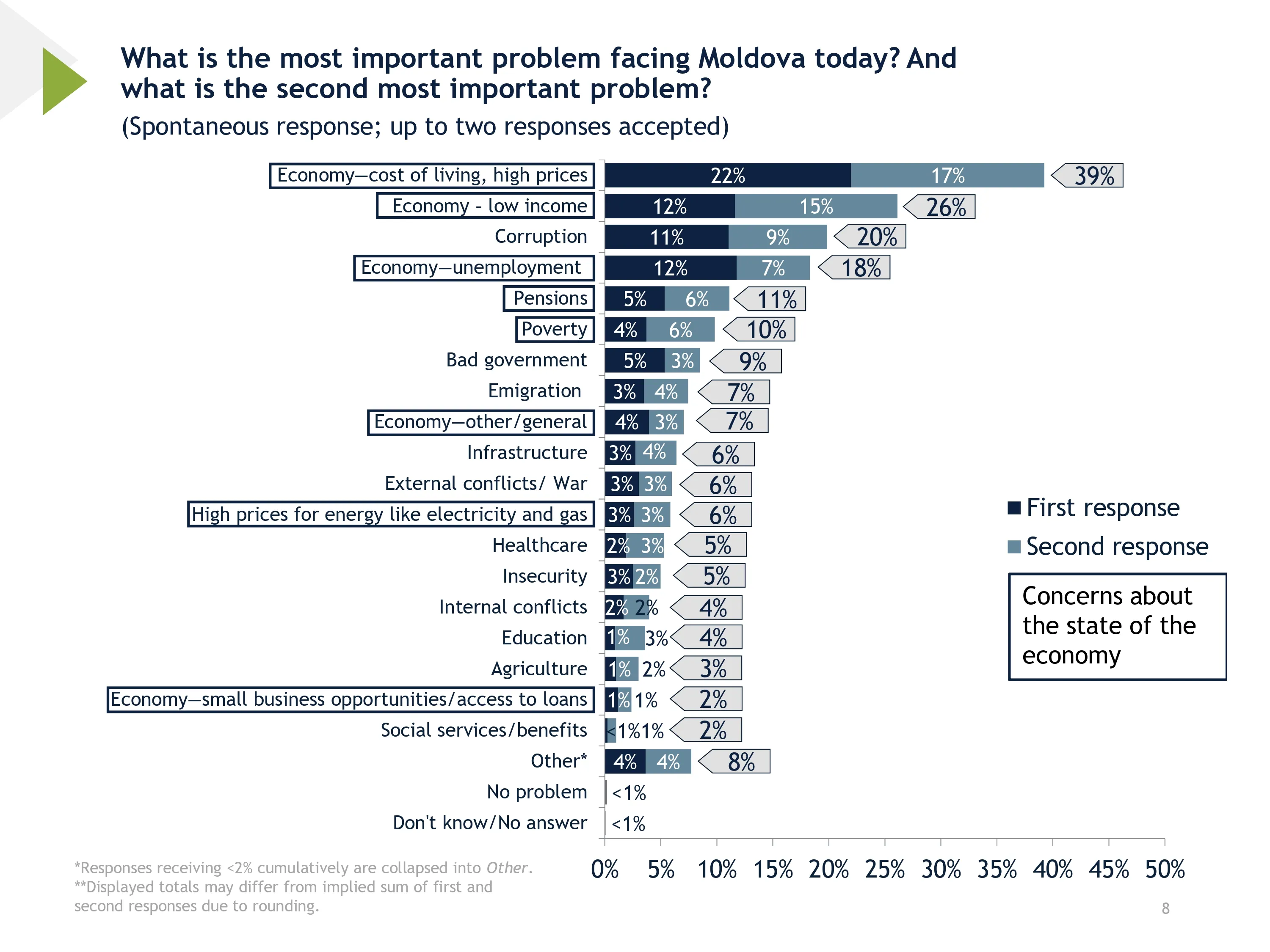Chiar dacă încrederea în direcția țării crește, principalele probleme resimțite de populație rămân de natură economică. 39% dintre respondenți au indicat scumpirile ca fiind principala problemă a țării, iar 26% au menționat veniturile mici.