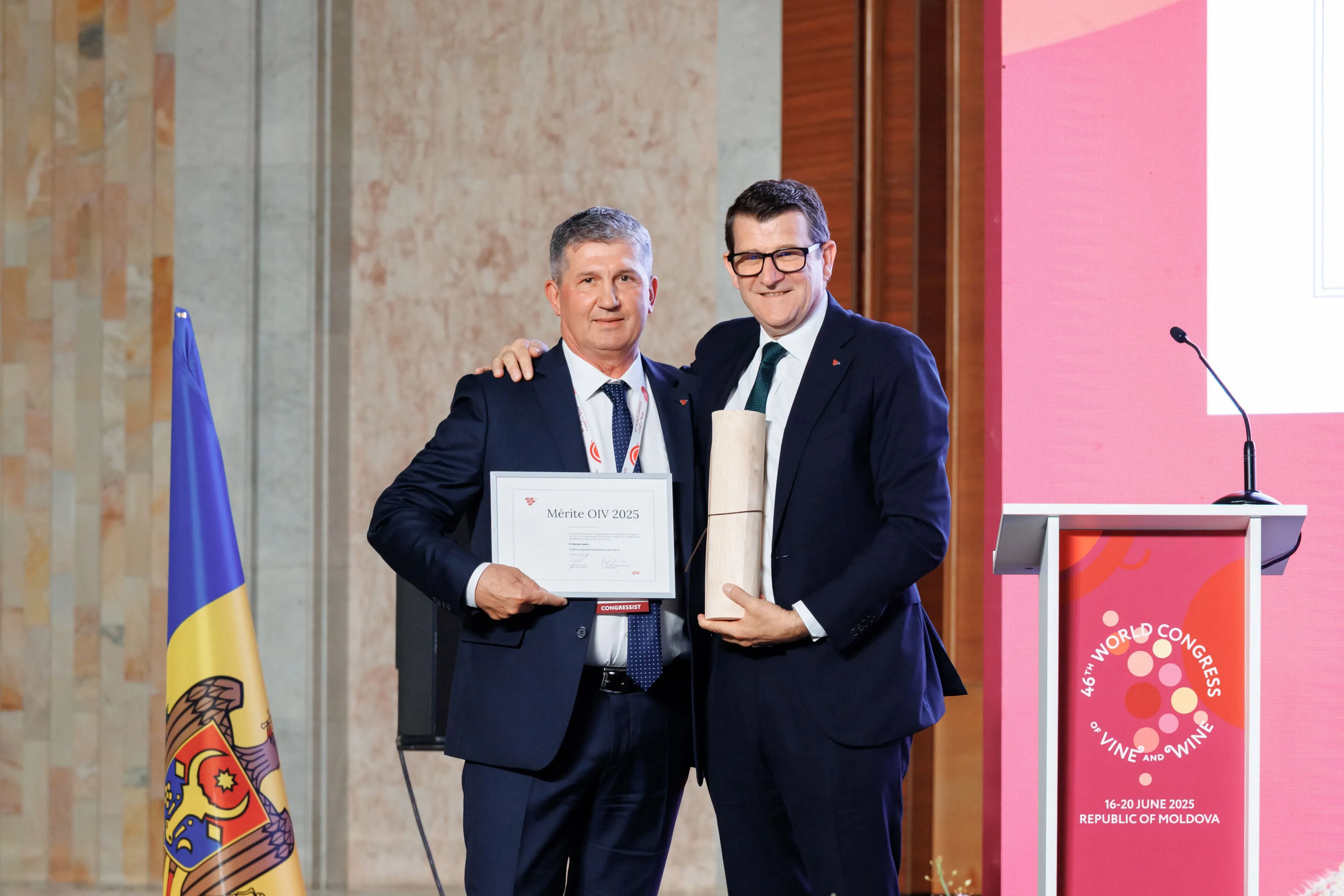 În cadrul Adunării Generale, OIV a acordat Distincții de Merit pentru patru persoane care s-au remarcat prin contribuțiile sale valoroase la activitatea Organizației. Este vorba despre Christiane Blum (Luxemburg), Ann Mohlén Årling (Suedia), Ricardo F. Nuñez (Argentina), dar și profesorul Gheorghe Arpentin din Republica Moldova. Acesta este considerat un lider al sectorului vitivinicol, atât la nivel național, cât și internațional.