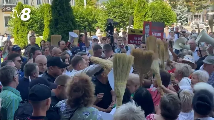 Atac cu... mături asupra premierului Recean. Acesta a fost așteptat, azi dimineață, la Orhei, de protestatarii lui Ilan Șor, înarmați cu mături și pancarte. Câteva zeci de manifestanți au înconjurat oficialul în timp ce își făcea loc să treacă spre clădirea consiliului raional, iar bodyguarzii și poliția au avut grijă ca nimeni să nu-l atingă.