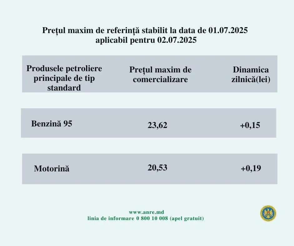 Prețul motorinei și al benzinei este creștere bruscă. Agenția Națională pentru Reglementare în Energetică (ANRE) anunță noile prețuri la carburanți pentru 2 iulie 2025. Astfel, motorina se va scumpi cu 19 bani, iar benzina cu 15 bani.