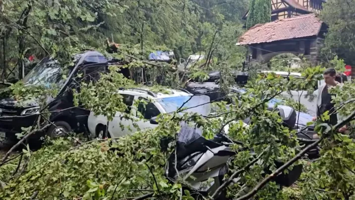 O furtună puternică, care a durat doar cinci minute, a făcut prăpăd astăzi în orașul Sinaia, România. Vântul cu putere de uragan a doborât mai mulți copaci, care au căzut inclusiv peste oamenii aflați pe stradă. 16 persoane au fost rănite și duse la spital. Vijeliile au făcut prăpăd și la Mioveni, în județul Argeș, dar și județul Timiș a fost măturat de furtuni pentru a doua zi la rând.