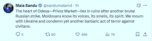 Președinta Republicii Moldova, Maia Sandu, a condamnat atacul rusesc asupra pieței Privoz din orașul ucrainean Odesa. Oficiala a transmis un mesaj de condoleanțe pe platforma X, exprimând solidaritatea cu poporul ucrainean.