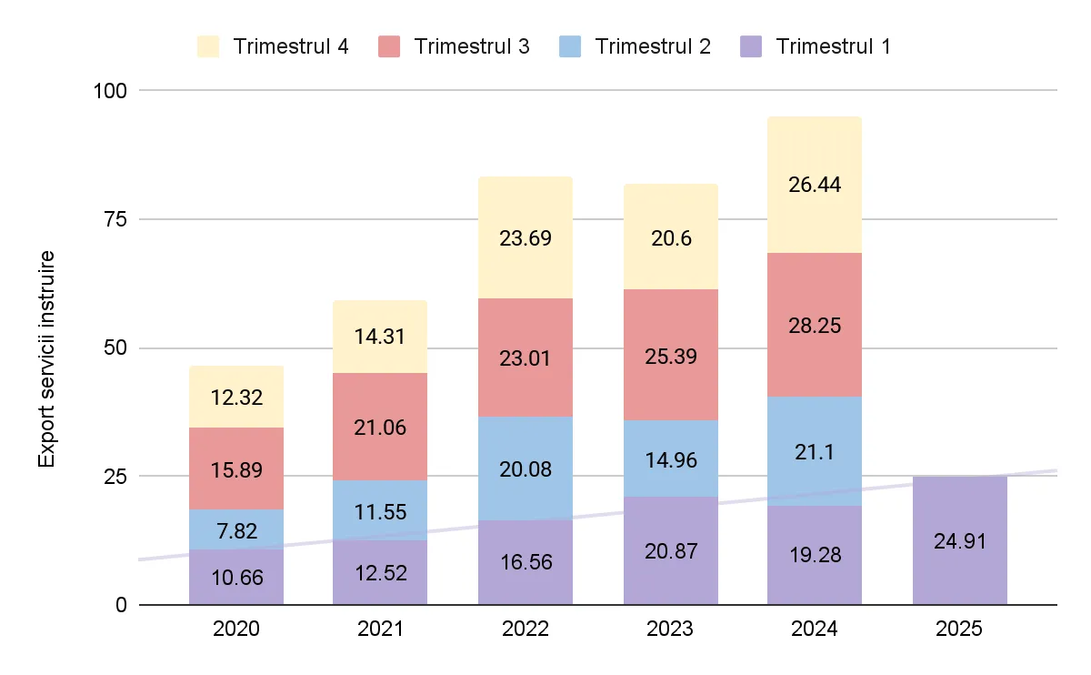 În ceea ce privește exportul de servicii educaționale, se înregistrează o creștere cu 134% în ultimii cinci ani, de la 10,66 milioane USD în primul trimestru al anului 2020 la 24,91 milioane USD în primul trimestru al lui 2025. Majoritatea studenților vin din țările vecine, fiind atrași de programe internaționale, costuri accesibile și oportunitățile perspectivei de integrare europeană.