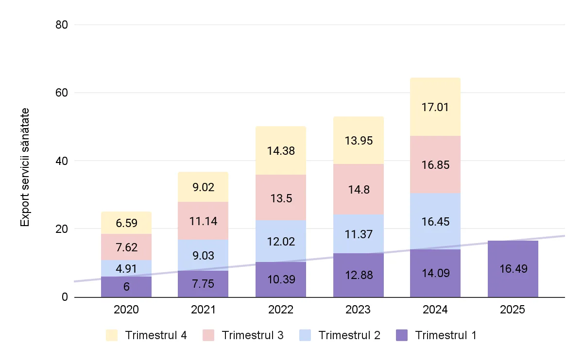 Datele din primul trimestru al anului 2024 arătau exporturi de servicii medicale în valoare de 14.09 milioane USD, în timp ce în primul trimestru al anului 2025, acestea au ajuns la 16.49 milioane USD – o creștere de aproape 17%.