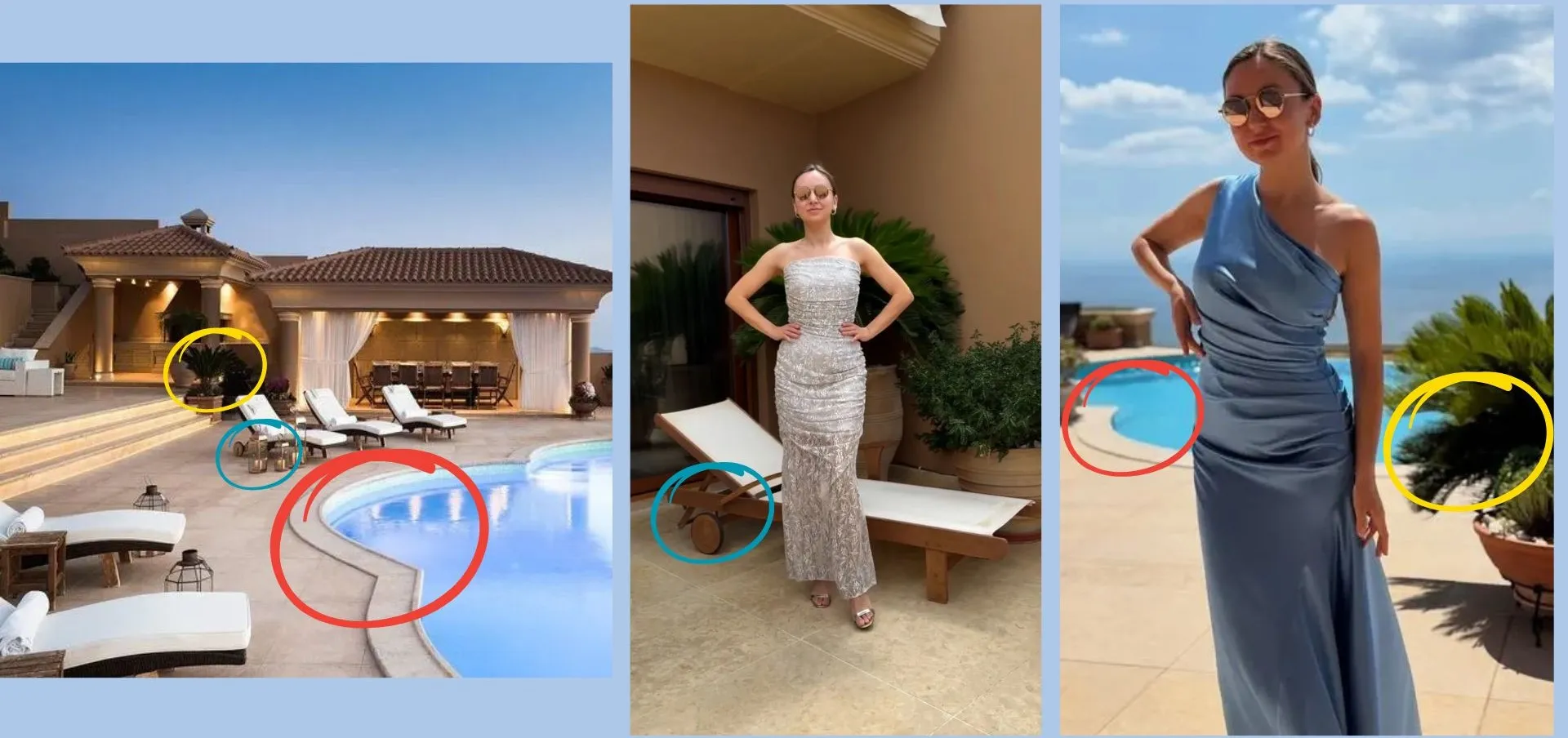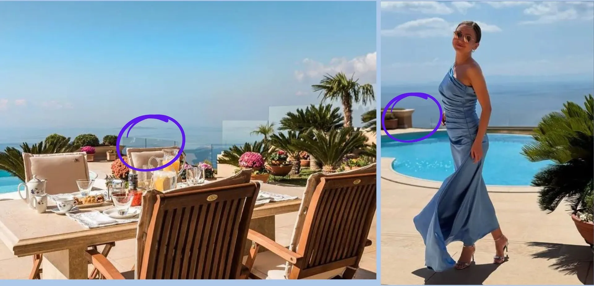 Printre alte asemănări se numără orientarea piscinei spre mare, cu orizontul jos și insulițe vizibile în depărtare, precum și poziționarea plantelor decorative lângă zona de relaxare.
