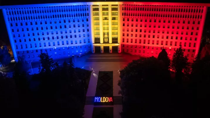 Seara festivității dedicate Zilei Independenței Republicii Moldova s-a încheiat cu un moment simbolic. Clădirea Parlamentului a fost iluminată în culorile tricolorului – albastru, galben și roșu.