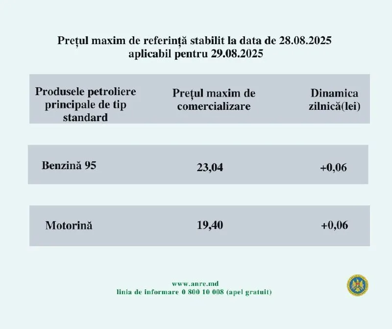 Prețul carburanților crește. Agenția Națională pentru Reglementare în Energetică (ANRE) anunță noile prețuri la carburanți pentru ziua de vineri, 29 august 2025. Astfel, benzina și motorina se vor scumpi cu 6 bani.