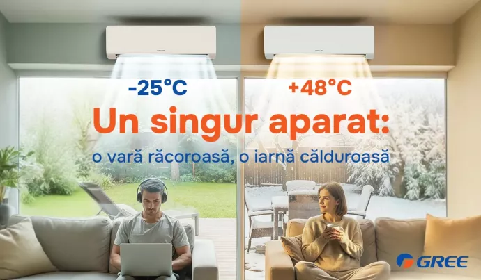 Climatizoarele Gree sunt alegerea inteligentă care îți aduce confort în orice sezon, fără costuri exagerate și fără bătăi de cap. Cu un singur aparat de aer condiționat poți păstra confortul pe tot parcursul anului. Indiferent că afară sunt +48°C sau -25°C, aparatul își face treaba. Răcește rapid aerul pe timp de caniculă și îl încălzește confortabil iarna, chiar și în cele mai reci zile.