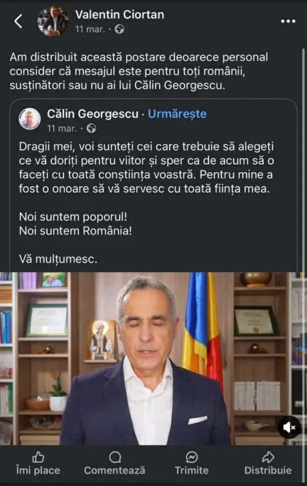 Pe 11 martie, Valentin Ciortan a distribuit pe Facebook un mesaj al lui Călin Georgescu, însoțit de comentariul: „Am distribuit această postare deoarece personal consider că mesajul este pentru toți românii, susținători sau nu ai lui Călin Georgescu”.