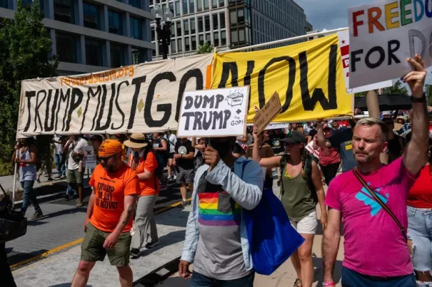 Protestatarii de la marșul „We Are All D.C.”, printre care se aflau imigranți fără acte și susținători ai statului palestinian, au scandat sloganuri împotriva lui Trump și au purtat pancarte pe care scria „Trump trebuie să plece acum”, „Eliberați D.C.” și „Rezistați tiraniei”.