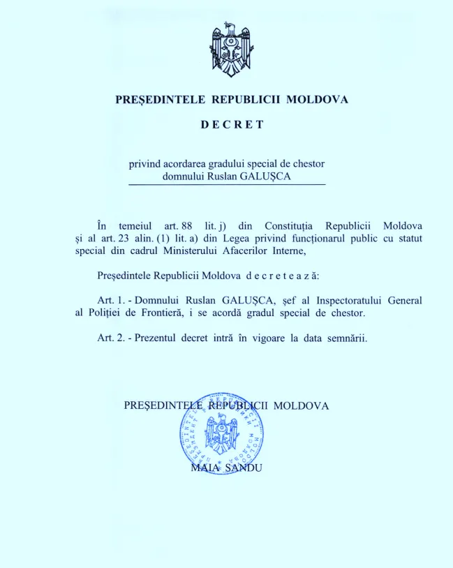 Șeful Inspectoratului General al Poliției de Frontieră, Ruslan Galușca, a fost avansat la gradul special de chestor. Decretul a fost semnat pe 16 septembrie, de președinta Maia Sandu și a intrat deja în vigoare.