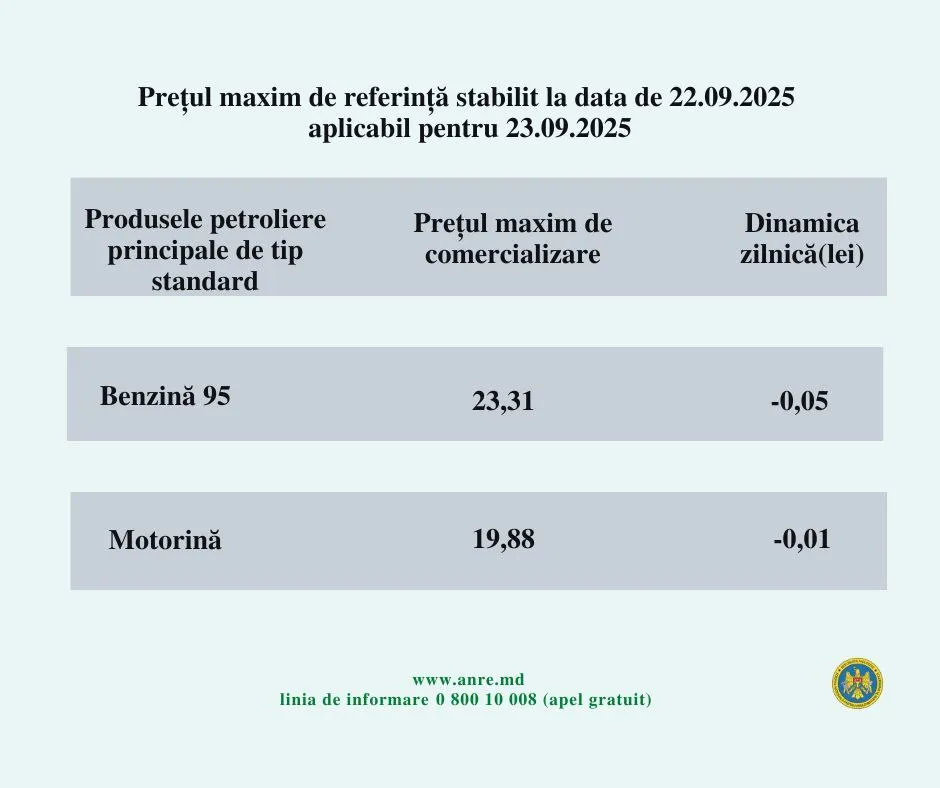 Prețul carburanților scade. Agenția Națională pentru Reglementare în Energetică (ANRE) anunță noile prețuri la carburanți pentru ziua de marți, 23 septembrie 2025. Astfel, benzina se va ieftini cu 5 bani, iar motorina cu 1 ban.