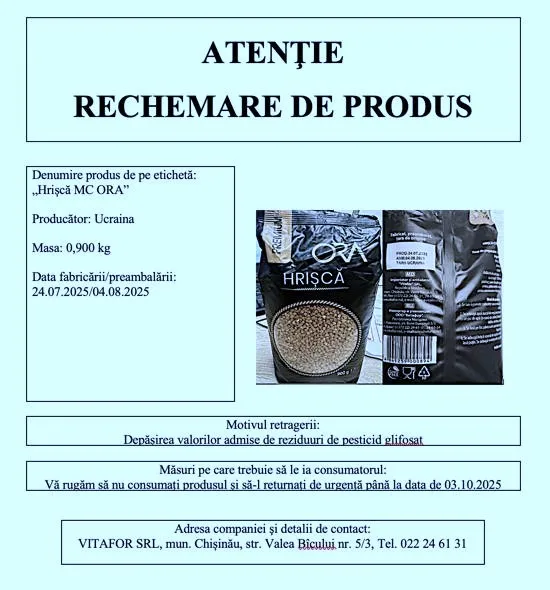 Agenția Națională pentru Siguranța Alimentelor (ANSA) retrage de pe piață un lot de pachete cu hrișcă. Decizia a fost luată după ce în produs au fost depistate niveluri crescute de reziduuri de pesticid „Glifosat”.