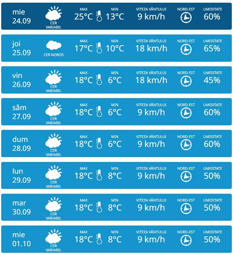 Ziua temperaturile vor scădea cu 7-8 grade, iar pe alocuri va ploua. Nopțile vor deveni și mai reci – în nordul țării, din noaptea de joi spre vineri, termometrele vor coborî până la doar +3 grade. Vreme răcoroasă, dar fără precipitații importante, se va menține și săptămâna viitoare.
