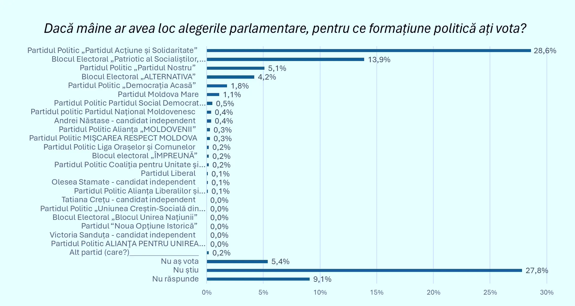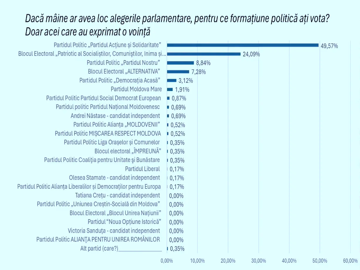 Potrivit răspunsurilor participanților, PAS, condus de Igor Grosu, ar obține 28,6% din voturi. BCS ar acumula 13,9%, iar Partidul Nostru, al cărui lider este Renato Usatîi, ar fi votat de 5,1%% dintre respondenți.