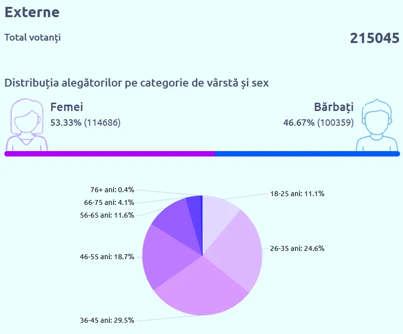 Aproximativ 215.000 de moldoveni din diaspora au mers la urne pentru alegerile parlamentare, până la ora 18:00. Prin comparație, la aceeași oră au votat peste 258.000 de alegători în turul II al prezidențialelor din 2024 și circa 163.000 la parlamentarele din 2021.