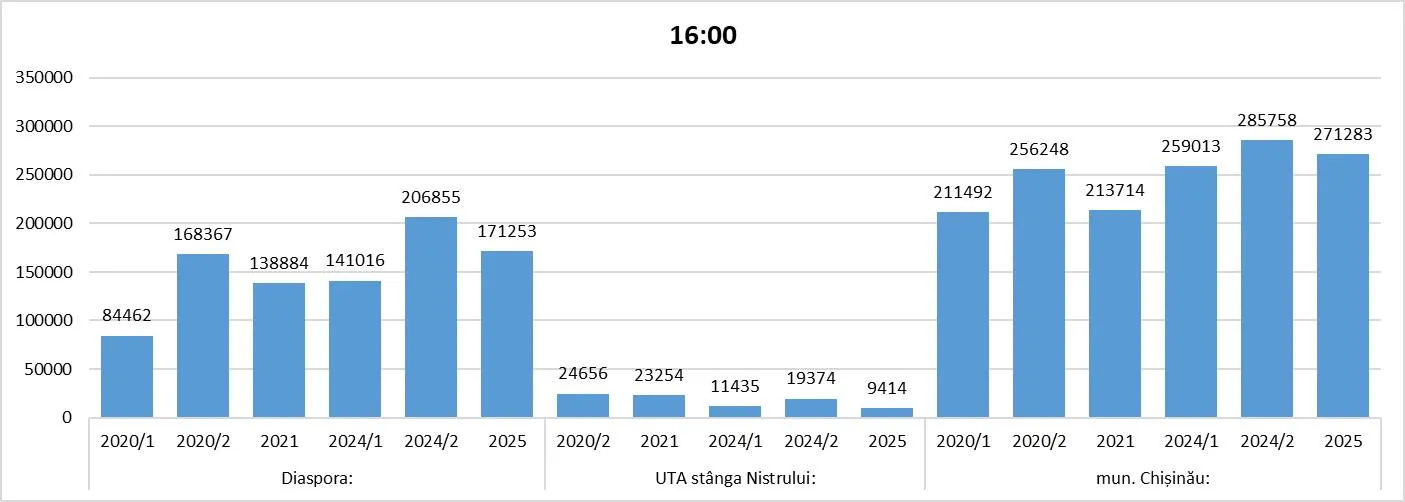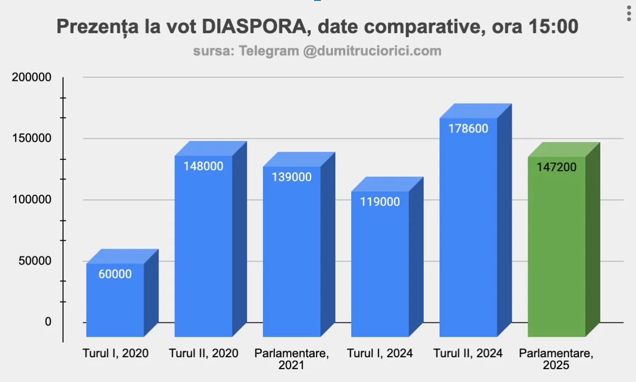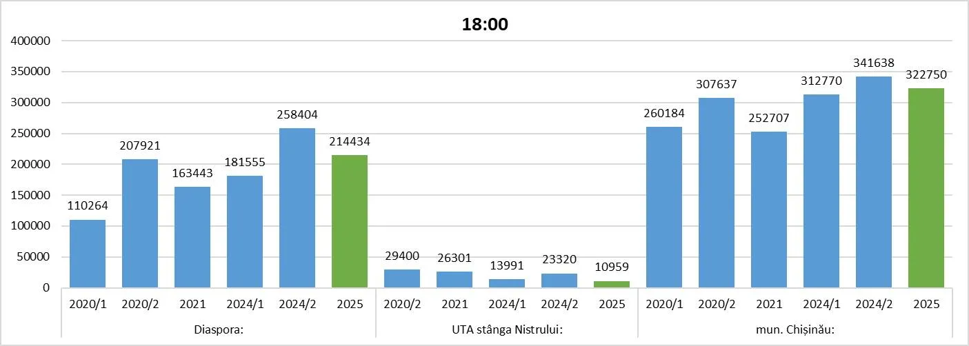 UPDATE 18:00 Aproximativ 215.000 de moldoveni din diaspora au mers la urne pentru alegerile parlamentare, până la ora 18:00. Prin comparație, la aceeași oră au votat peste 258.000 de alegători în turul II al prezidențialelor din 2024 și circa 163.000 la parlamentarele din 2021.