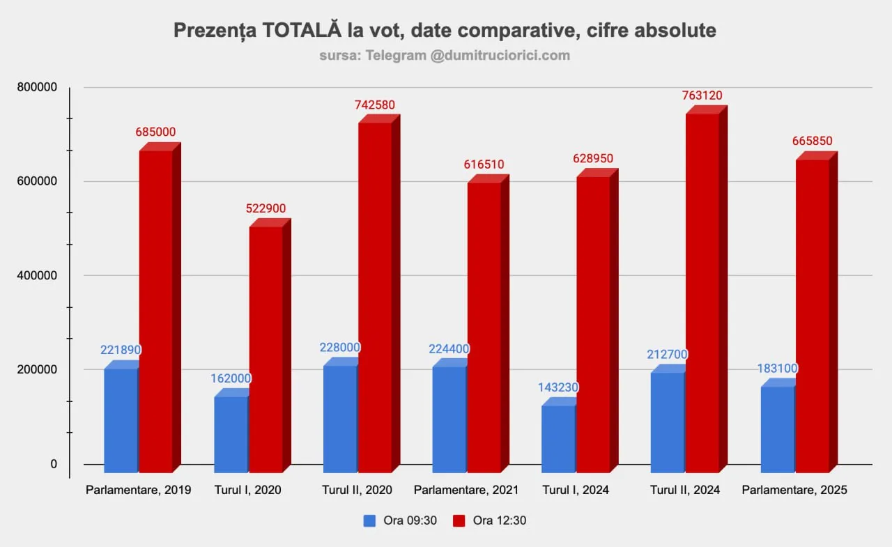 UPDATE 12:30 Datele comparative arată că prezența la vot la această oră (23,50%) este ușor peste nivelul turului I la prezidențialele din 2024 (22,50), dar sub nivelul turului II (26,70%) și aproape de parlamentarele din 2021 (23,70%).