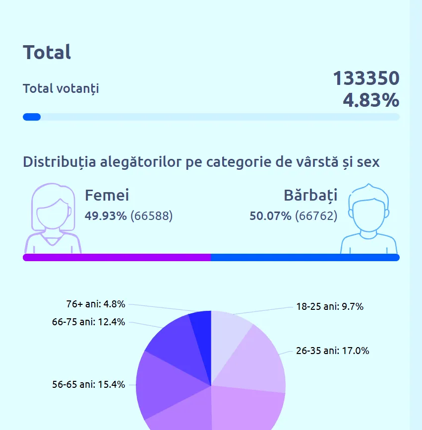UPDATE 12:00 Circa 600.000 de persoane (21,14%) au participat la alegerile parlamentare până la această oră. Femeile (52,45%) au preluat inițiativa și rămân mai active decât bărbații (47,55%).