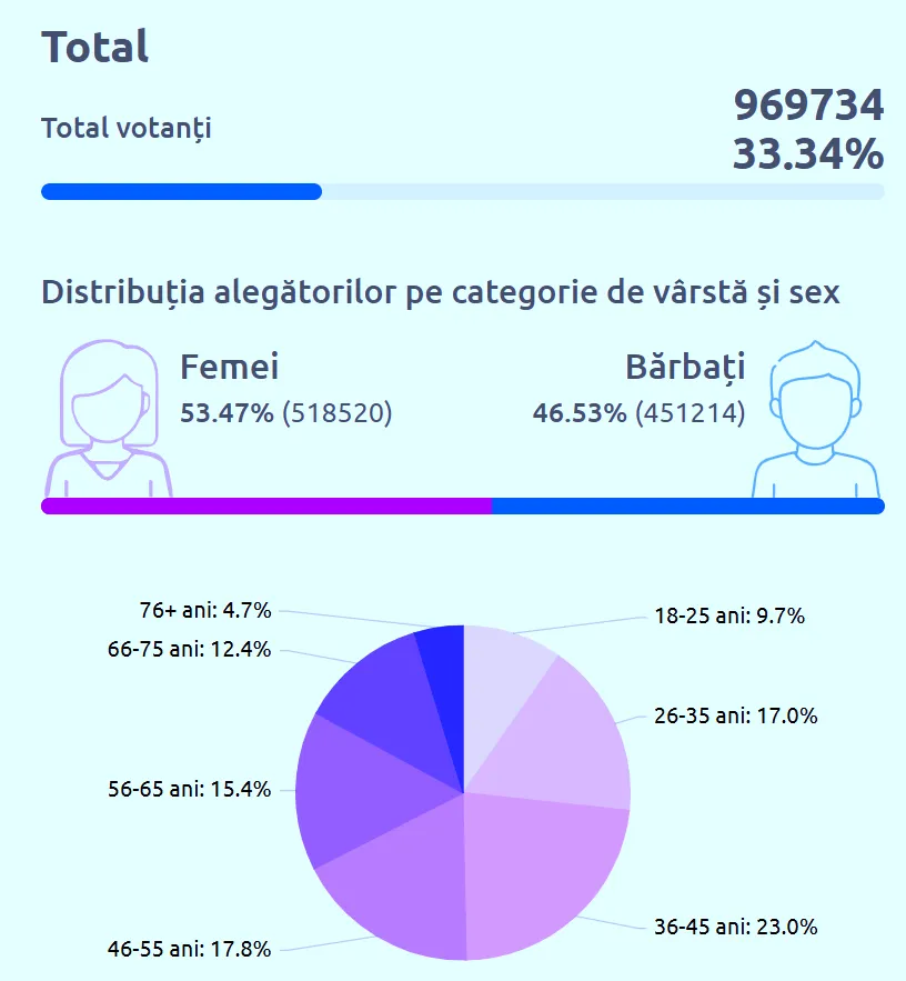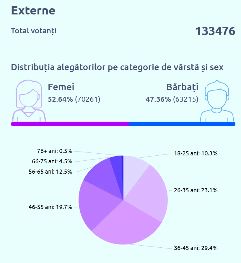 Femeile sunt cele mai active la vot. Cât despre categoria de vârstă, tinerii de 18-25 de ani și persoanele 76+ ani sunt cei mai pasivi.