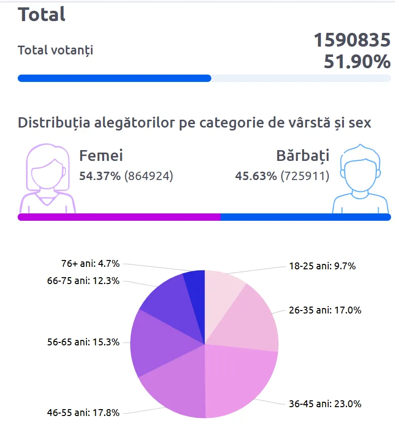 Potrivit datelor afișate de CEC, până la ora 21:00, atât în țară cât și peste hotare au votat 51,90%, adică 1.590.835 de oameni din electorat.