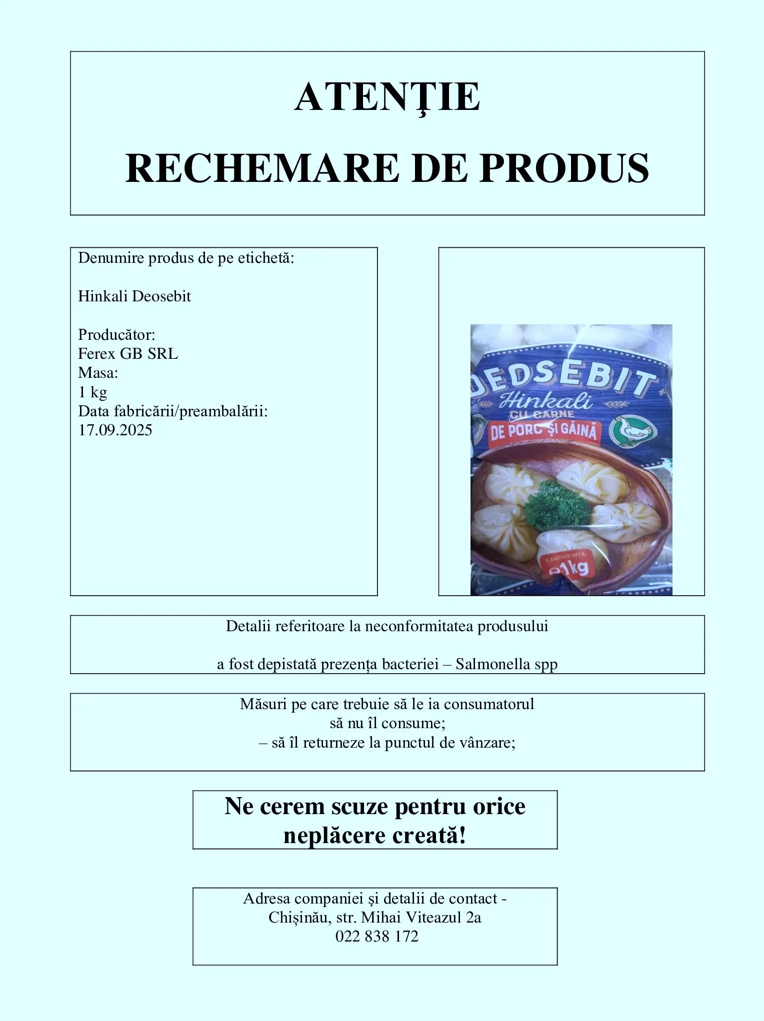 ANSA a anunțat rechemarea de pe piață a unui lot de hinkali, la solicitarea operatorului din domeniul alimentar. Decizia a fost luată după ce în produs a fost depistată bacteria Salmonella spp.