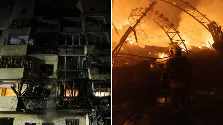 Serviciul de Stat al Ucrainei pentru Situații de Urgență (SES) a precizat că într-unul dintre blocurile cu mai multe etaje au fost parțial distruse acoperișul și două apartamente, iar într-un imobil cu cinci etaje a izbucnit un incendiu într-un apartament.