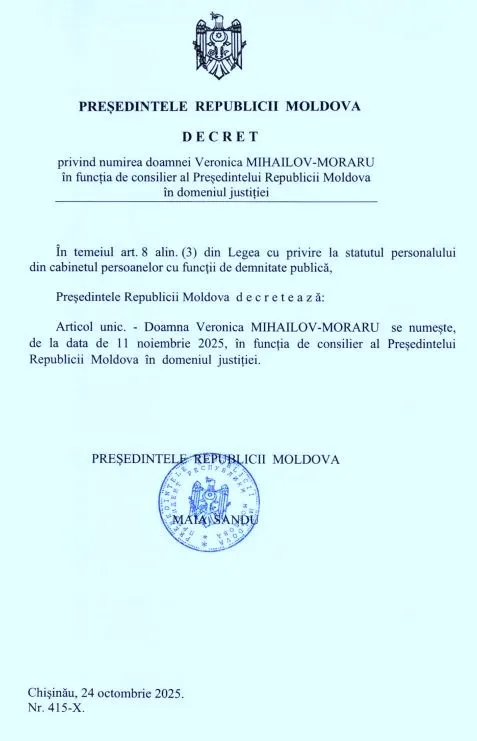 „Veronica Mihailov-Moraru este juristă cu o vastă experiență profesională. De-a lungul carierei, a activat în instituții publice și organizații neguvernamentale, contribuind la elaborarea și implementarea politicilor de consolidare a statului de drept, măsurilor anticorupție și promovarea protecției drepturilor omului”, se arată într-un comunicat al Președinției.